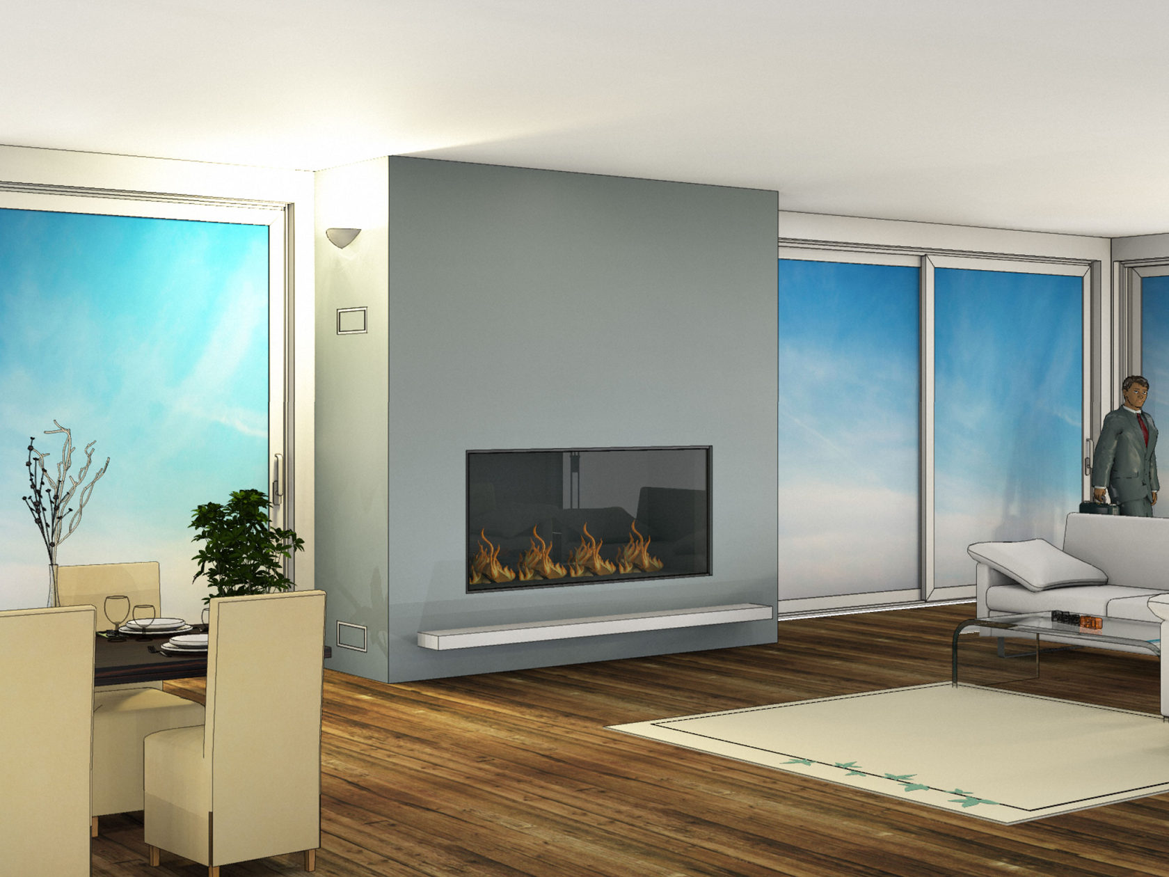 По задумке заказчика был разработаны и согласованы технический проект и визуализация трехстороннего камина в современном стиле. Для камина была выбрана трехсторонняя немецкая топка Arte 3RL-80h-4S с подъемным механизмом, а также изготовлена на собственном производстве полка для облицовки из натурального мрамора.